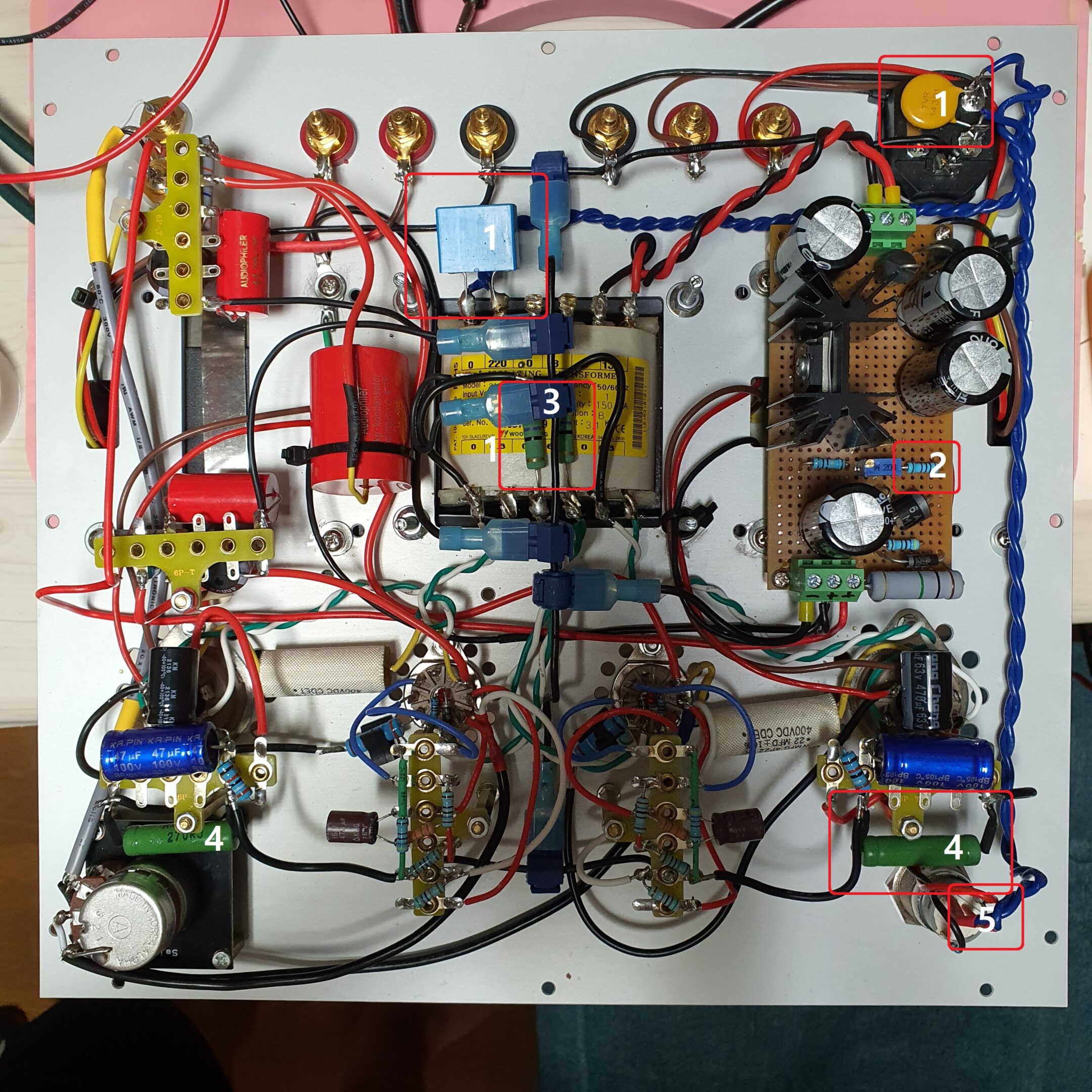 꽤 많은 시행착오가 있었지만 결국 아래와 같은 수정/보충 사항으로 마무리! 스파크킬러를 전원트랜스에, 바리스터를 AC Inlet에 추가해서 끄고 켤 때 나는 퍽 소리 제거 정전압 리플 필터의 디바이드 저항을 47K에서 10K로 교체해서 B전압이 306V 밖에 안 나오던 것을 325V로 상향 가끔 발생하던 Pop noise 제거를 위해 초단관 히터 전원에 가상중점을 만들어 접지하기 위해 47ohm 3W 저항을 …