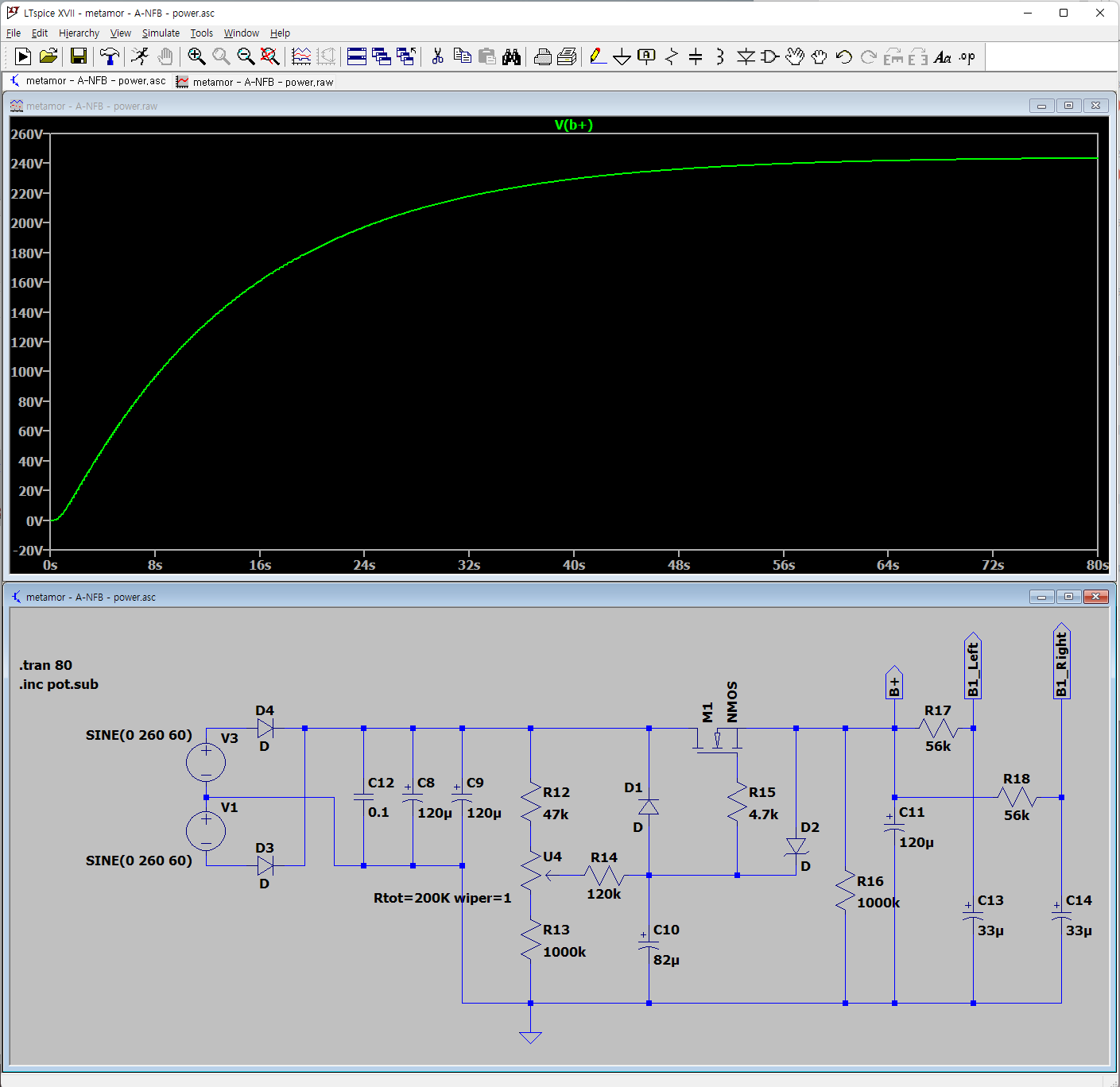 아래 회로는 앰만사 회원이신 저믄엉아 김광호 회원님께서 앰만사 표준 리플 필터 회로를 수정하신 회로입니다. 준비하고 있는 Metamor 앰프에 사용될 전원부인데 앰프 회로에 포함시켜 그려봤더니 시뮬레이션이 잘 안나오는 당황스런 상황이… 일단 자고 일어나서 토요일에 한참 째려보다가 시뮬 시간을 10m에서 1초로 늘려봤더니 B+ 전압이 계속 상승하는 모양이 보입니다. 그래서 시간을 계속 늘려보니 그제서야 이 회로가 기본적으로 시간이 …