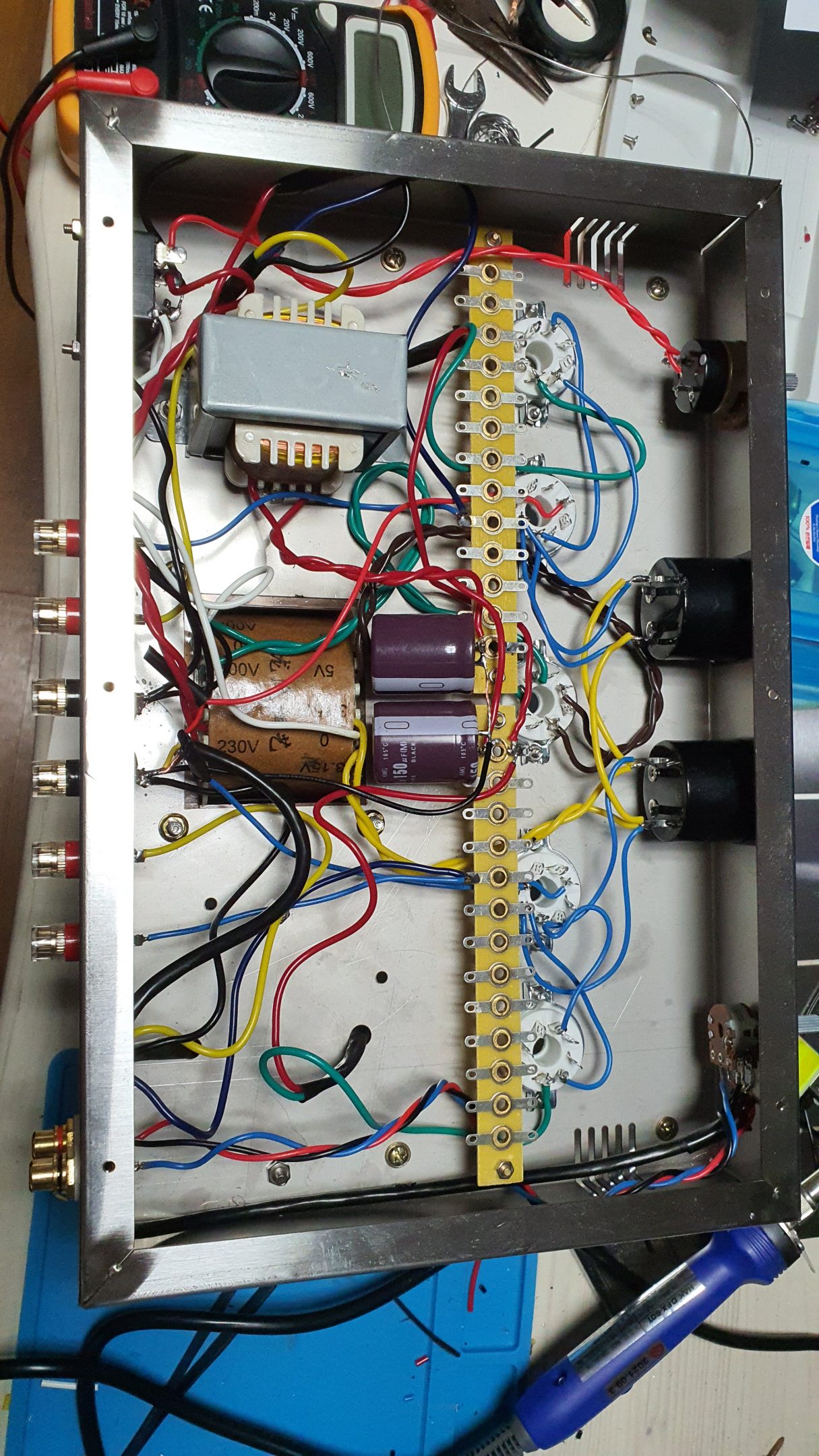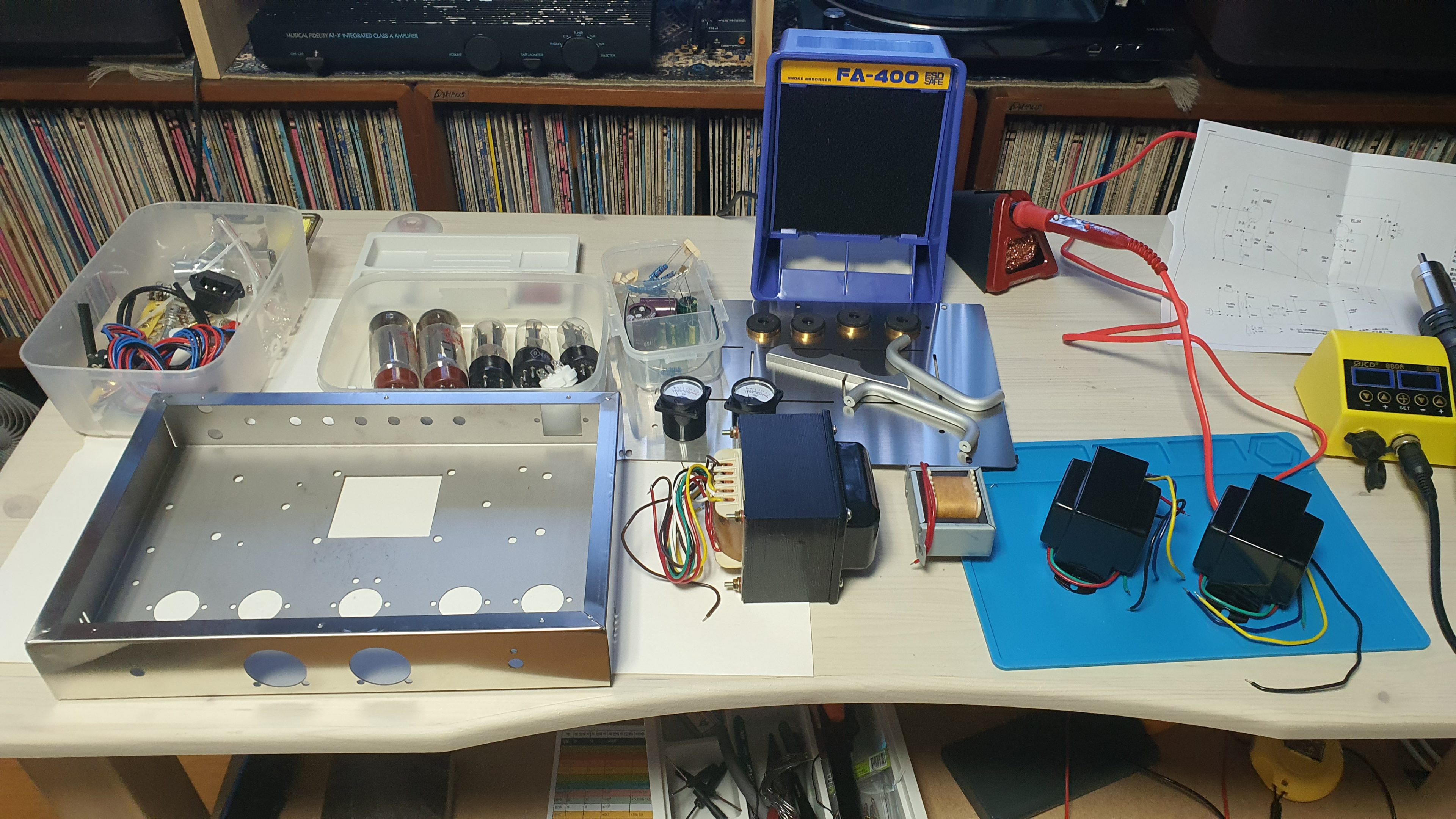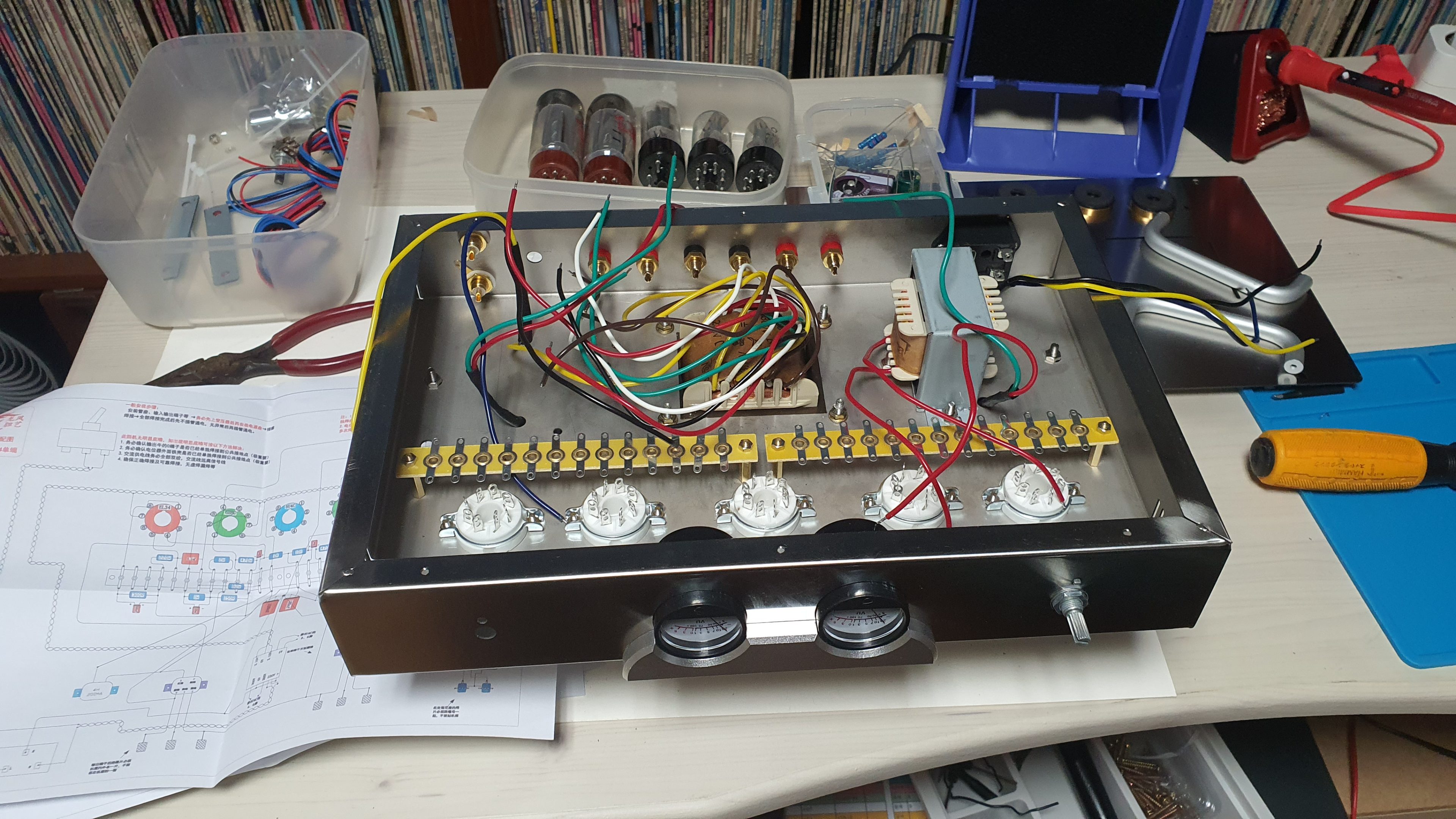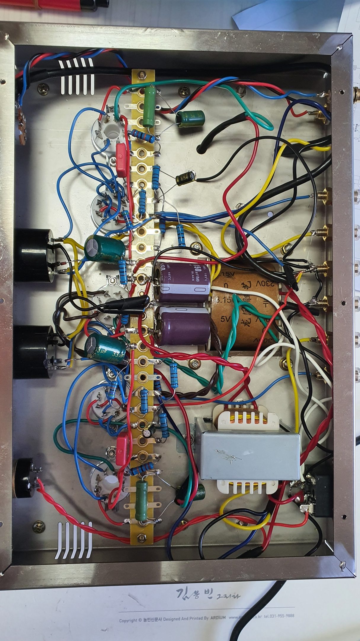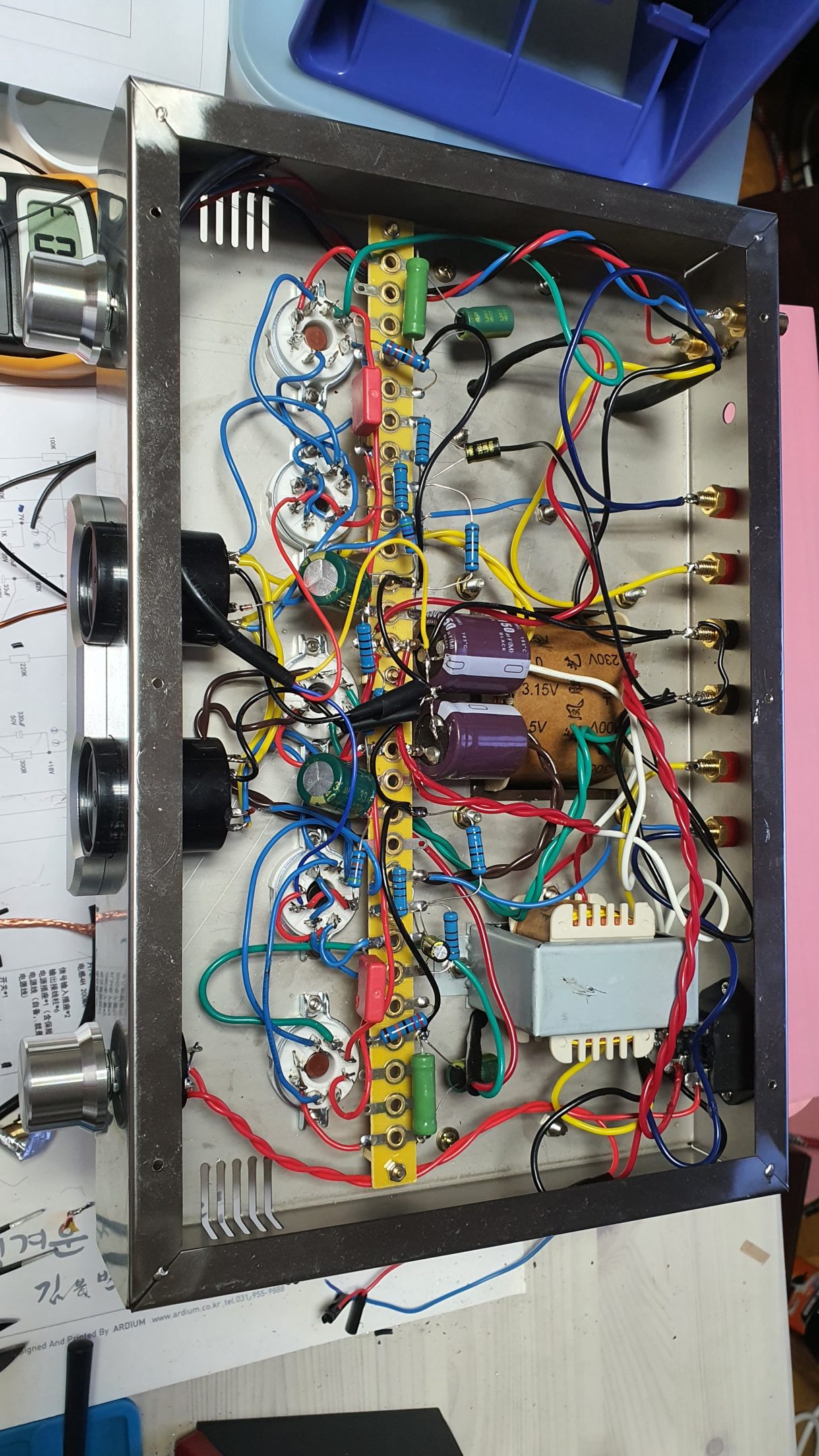 설 연휴 시작 전에 도착했으면 좋았을텐데 관세가 부과되는 바람에 늦어진 듯.부품들을 약간 정리해 봤습니다드라이버와 스패너로 조립할 수 있는 부분을 먼저 합니다. 이 때는 몰랐습니다. 진공관 소켓에 키가 있다는 사실을… ㅡ.ㅡ 그 다음은 배선 작업. 그 사이에 인두가 중국산에서 하코로 바뀌었죠? 중국산 인두로는 하드와이어링 못한다는 사실을 깨닫고 좌절…진공관 소켓들을 돌리느라 진공관 배선을 다 떼어내고 개삽질을 함. 결국 1차 조립 완료했으나… 개같이 멸망. 소리가 안 나와요 ㅠㅠ 보니까 접지 배선이 일부 안됨 ㅡ.ㅡ검은 선이 몇 개 추가된 최종 배선. 하지만 여기에 냉납이라는 복병이… 나오라는 음악은 희미하게 들리고 엄청난 발진음이… 여기서 몇 시간을 더 투입해서야 발진을 제거할 수 있었습니다 최종 완성! 음악이 나옵니다. 이 정도면 첫 시도로는 나쁘지 않은 듯 하네요