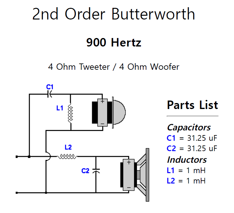 꽤 들을만한 소리가 나왔습니다. 나름 만족스러웠지만 부품 값을 최소화하기 위해서 (4.7uF / 0.33mH) 4KHz를 선택했더니 아무래도 고역이 많이 잘린 것 같습니다. 그러다가 어디서 저 트위터가 꽤 물건이라는 이야기를 듣고 네트워크를 바꿔보기로 합니다. 이번에는 트위터에 일을 많이 시키도록 900Hz를 선택했습니다. 1Hz 같은 값 대신 900Hz를 택한 이유도 역시 저렴한 부품으로 구성할 수 있었기 때문입니다. (33uF / 1mH)