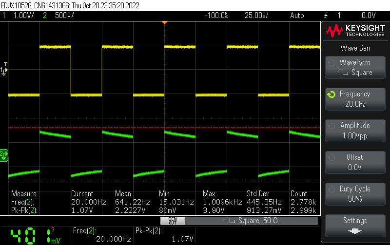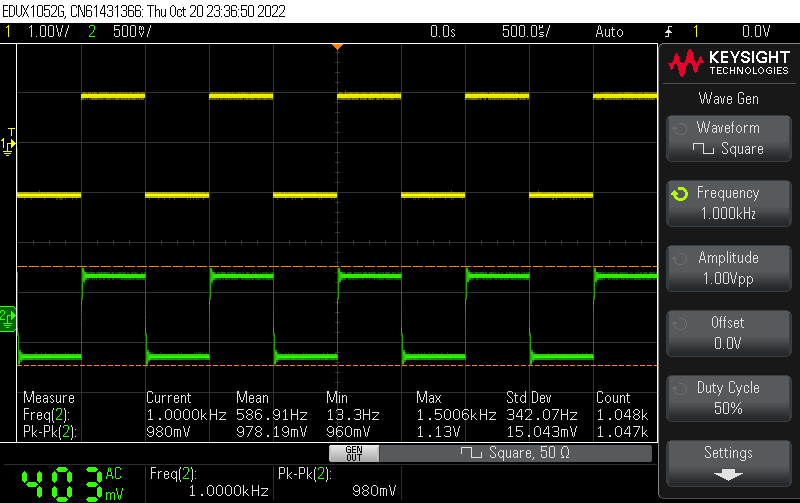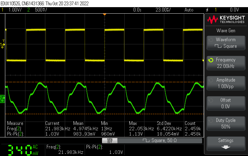 2V p-p 입력에 1V p-p 출력이 나오도록 볼륨을 줄이고 방형파를 측정해봅니다