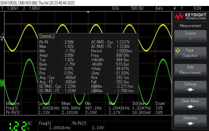 이제 다시 측정을 해봅니다. Peak-peak 2V의 입력을 줍니다.