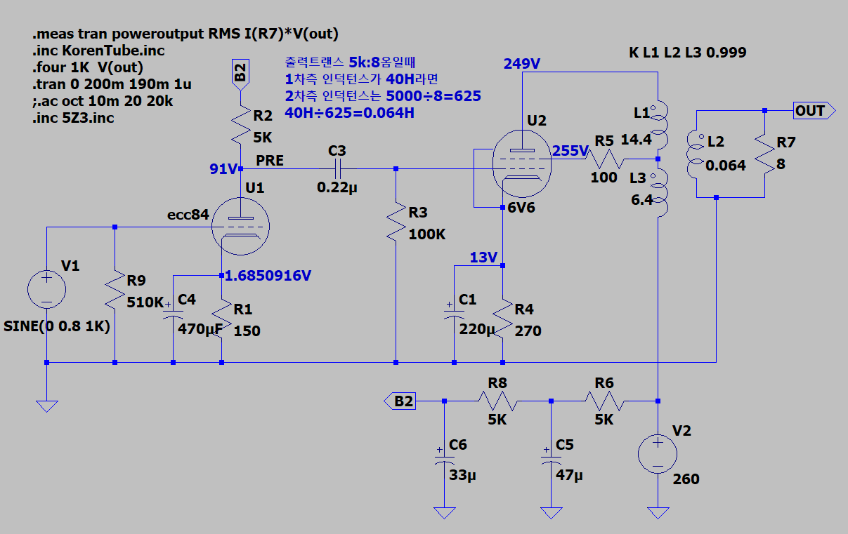 여기서 250 플레이트 전압을 선택하기로 합니다. 45mA를 맞추면 되겠네요. 그래서 가장 간단한 형태의 SE amp 회로를 시뮬레이션 해봅니다.