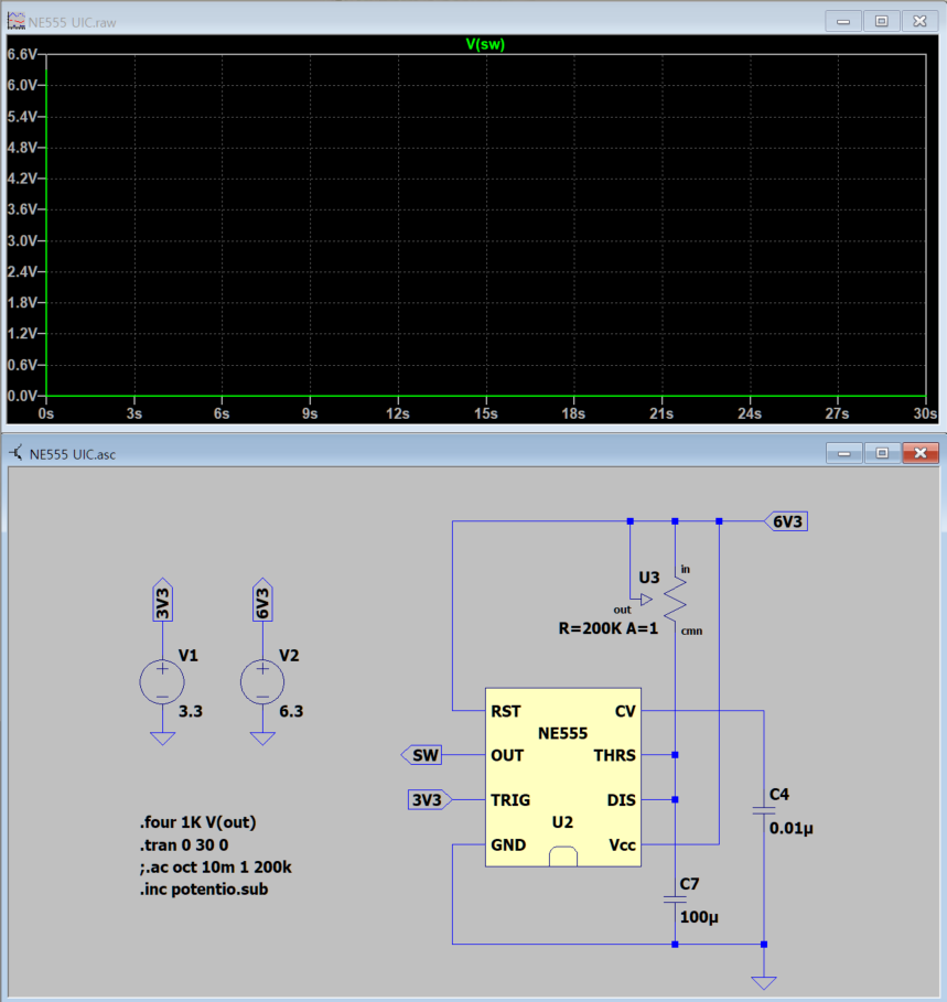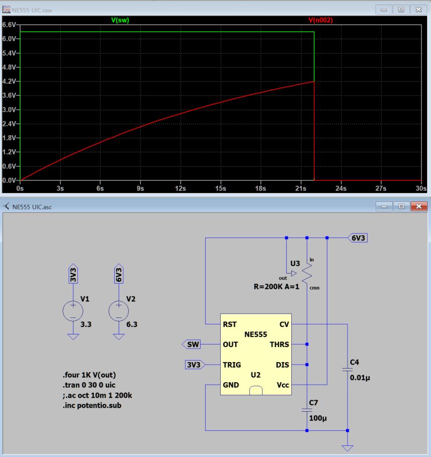 6.3V를 출력하다가 약 22초 후에 떨어져야 하는데 처음부터 떨어진 상태로 그려집니다. 검색을 해보니 이런 경우가 발생하면 SPICE에서 권장하지는 않지만 UIC 옵션을 tran에 줘야 한다는군요.
