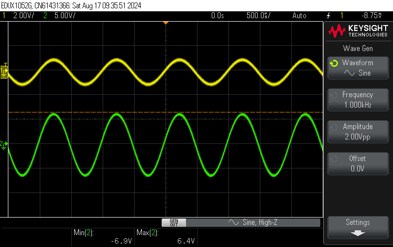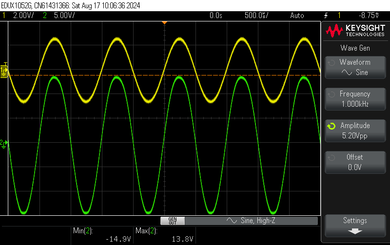 클리핑 생기기 직전 5.2Vpp에서 28.7Vpp 정도 측정됩니다. 14.5V peak로 치면 약 13W 정도 되겠네요.