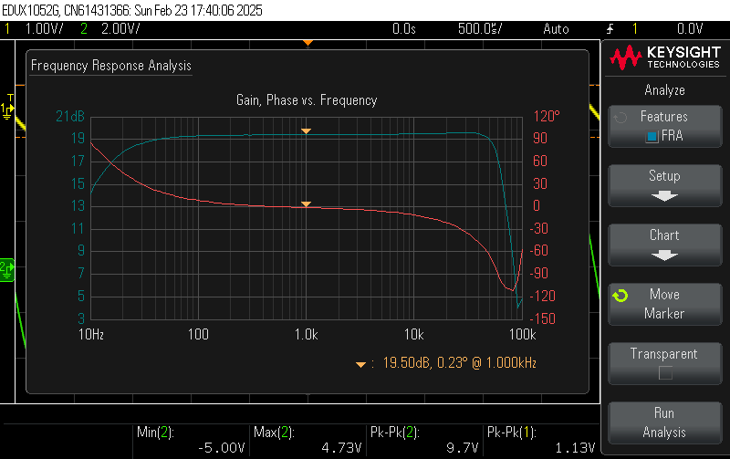 19.5dB 출력으로 약 8.5dB 피드백을 주었고 470R 피드백 저항에 5.5nF 캡을 달아서 고역을 깎았는데, 10KHz 위에서 사알짝 올라오는 것을 더 누르려면 5.5nF보다 더 키워줘야 합니다만 그러면 발진이 시작해서 이정도로 멈췄습니다.
