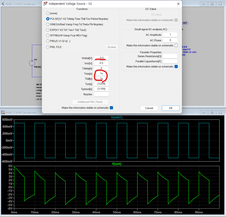 V에 Pulse를 사용하면 되는데 깨알팁이 있습니다. 0.5V swing하게 만들려면 Vinitial에 -0.5V를 주고 Von에 0.5V를 주면 됩니다 그리고 Trise, Tfall에 0을 주거나 비워두면 0.5ms의 rise/fall time을 가지게 됩니다. 그냥 1u 정도 써넣으면 되겠습니다.